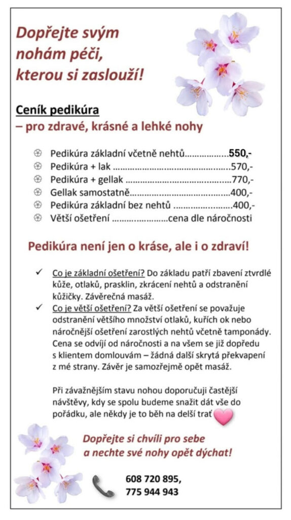 Odborná péče navíc podporuje správnou hygienu a přispívá k celkovému pocitu lehkosti a uvolnění. Zdravé a upravené nohy jsou základem nejen krásného vzhledu, ale i dobrého pocitu při chůzi.